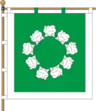 На квадратному зеленому полотнищі з білою облямівкою на бічних і нижньому пругах, шириною в 1/10 від ширини прапора, коло з дев'яти білих каменів.