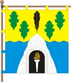 Квадратне полотнище розділене хвилясто горизонтально на дві рівновеликі частини – жовту і синю. З нижнього пруга виходить біла кам’яна гора з білою мурованою аркою, в чорному отворі якої білий вертикальний смолоскип із червоним полум’ям з жовтою облямівкою. На верхній частині над горою чорна вертикальна лебедина пір’їна, від гори до верхніх кутів відходять діагонально по два зелених вертикальних дубових листки.