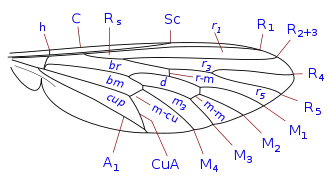 поздовжні жилки: C: костальна; Sc: субкостальна; R: радіальна; M: медіальна; Cu: кубітальна; A: анальна .