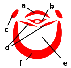 a: верхня губа; b: гіпофарикс; c: верхньощелепна пальпа; d: максила; e: ротовий канал; f: нижня губа