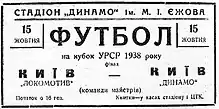 - 15 жовтня 1938 року (субота). 16.00. Київ. Стадіон «Динамо» ім. Єжова. 15000 глядачів.