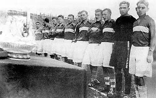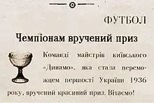 | … Наконец завершился розыгрыш футбольного Кубка Украины. Мы пишем… что турнир был омрачен и продлен из-за курьеза: он должен был закончиться 15 октября, но последний матч сыгран 17 числа… 11 октября в поединке финального этапа «динамовцы» Киева превзошли харьковский «Локомотив» со счетом 1:0, но гости с опозданием на четыре дня подали протест на судью и потребовали переиграть встречу. Республиканский Комитет физкультуры и спорта решил уладить раздор проведением дополнительного матча (финала) между киевлянами и харьковчанами… Победило «Динамо» 2:0 (голы: Виньковатый на 34 и 65 мин.), сняв вопрос о лучшей команде республики: на протяжении всей встречи киевляне выглядели более предпочтительно, действовали с большим желанием. В этой неприятной ситуации есть положительный момент: дополнительный финал превратил осенний турнир… в два отдельные соревнования, первенство (решающий круг) и Кубок (предварительные этапы и поединок 17.10). Что-то похожее у нас уже было дважды: в 1932 и 1935 годах во время Всеукраинских Динамиад … | ||