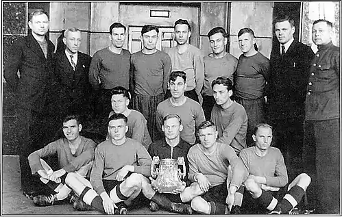 После третьего гола динамовцы несколько ослабили натиск и тут же были наказаны. Поварчук хорошо прошел к их воротам и передал мяч Потапову. Последовал сильный удар в верхний угол, и счет стал 3:1. В оставшееся до конца тайма время игра велась на середине поля, и вратари мало вступали в игру. Виньковатов хорошо играл и в нападении, и в защите. Второй хавтайм прошел под знаком явного преимущества «Динамо», но, несмотря на это, был насыщен интересной спортивной борьбой, закончившейся в итоге со счетом 5:1 в пользу столичной команды «Динамо», которая завоевала кубок второй раз подряд … |