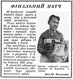 Після перерви гра довгий час не приносить нікому успіху. Та ось напад «Локомотива» виривається вперед і, скориставшись з метушні біля воріт хазяїв поля, зрівнює рахунок. Минає три хвилини. М’яч провів Махиня. Обвівши кількох захисників, він стрімко наближається до воріт «противника». Сильний, влучний удар. Голкіпер Кустовський падає, але пізно. М’яч — у сітці. Динамівці повели з рахунком 2:1. Відчувається нервозність, починаються прояви брутальності. Доходить до того, що суддя Чернобильський примушений вивести з поля Ліфшиця («Динамо») і Авраменка («Локомотив»). На останніх хвилинах Шиловський майстерно забиває третій м’яч. Доля матчу, а відтак і кубка — вирішена … |