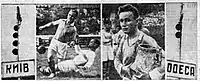 Рахунок на сьомій хвилині відкриває Шиловський, забиваючи красивий гол головою у ворота одеситів. Одеса прагне відіграти гол. І це їй майже вдається: Малхасов обводить захист і залишається один на один з воротарем Києва. На якусь мінімальну частину секунди Трусевич дістає м’яч раніше форварда Одеси. Певний гол врятований. Бурхливі оплески нагороджують воротаря столиці. Знову м’яч у київлян. Знову удар по воротах. На цей раз овації на адресу голкіпера Одеси Михальченка, що взяв, здавалося, мертвий м’яч. Київляни продовжують нападати. Чимало клопоту завдає захистові гостей невтомний Гончаренко (заради справедливості, треба сказати, що в двох випадках він виявив грубість). 23 хвилина позначається новим успіхом київлян. Той же Шиловський збільшує рахунок до 2:0. У одеського нападу щось не клеїться гра, та й тактика в цій грі якась своєрідна. В команді 4 нападника і 4 півзахисника. Незрозуміла система гри відбивається на її розвитку. Київляни домінують, але удари по воротах неточні. Після перерви Мельник замінює Чистова. Картина гри не змінюється. Все частіше форварди Києва тривожать Михальченка. Незабаром приходить і результат. Шиловський забиває третій м’яч. В цьому м’ячі цілком винний воротар Одеси. Затримавши м’яч, він дозволив йому перекотитися через руку за рису воріт. Через кілька хвилин небезпечний момент створює Гончаренко. Відтягнувши на себе захист, він класично викочує м’яч Щегоцькому. Останній блискавично б’є, й м’яч проходить у ворота трохи вище Михальченка, який упав. В однин з моментів гри вибуває Комаров. Його замінює Коротких, якому пасує Махиня. Не зупиняючись, він сильно шутує, і п’ятий гол у воротах Одеси. Одесити явно деморалізовані. Їх гравець Токар вганяє шостий м’яч у власні ворота … |