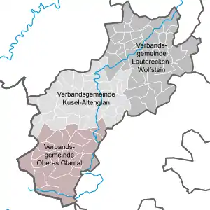 Район складається з 98 міст і громад (нім. Gemeinden), об'єднаних в 6 об'єднань громад (нім. Verbandsgemeinden).