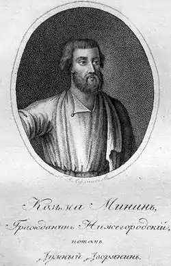 ![]() Кузьма Мініч Захар'єв Сухорукий Кузьма Мінін. Гравюра початку XIX століття | |
