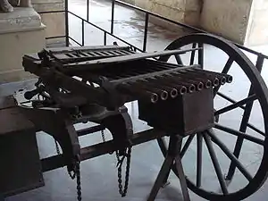 ![]() 10-ствольний кулемет Норденфельта гвинтівкового калібру (зі знятим бункером для набоїв). Musée de l'Armée, Париж. | |