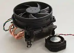 Як правило, використовується наступна схема: на тепловиділяючий компонент встановлюється радіатор. Найчастіше — з алюмінію або міді. На тепловиділяючу і радіаторну поверхні наноситься шар термоінтерфейс для зменшення втрат тепловіддачі, при можливих нерівностях цих поверхонь. На радіатор прикріплюється вентилятор, який вдуває повітря до цього радіатора. Для збільшення корисної площі радіатора (підвищення тепловіддачі) виробники вдаються до різних хитрощів і, внаслідок цього, радіатор часом приймає вельми незвичну цікаву форму. Але досить часто це є і прагненням виробників привернути увагу споживачів, небайдужих до таких дивних форм. У більшості випадків досягаються обидві мети.