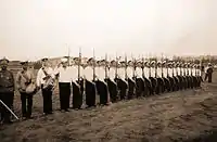 Оригінальний текст (рос.) ...Но каким образом можно было произвести прапорщика прямо в капитаны? Воинский устав этого не предусматривал. Тогда нашли следующий выход. Весь гарнизон был выстроен на Куликовом поле; командующий военным округом вызвал из рядов прапорщика Щеголева и, вручив ему пакет с приказом и новые погоны, произвел его в подпоручики. Затем, после того как подпоручик Щеголев вернулся в строй, его опять вызвали и произвели таким же образом в поручики, а через короткое время опять вызвали и произвели в штабс-капитаны, а потом и в капитаны. Причем знамена войск были развернуты и гремела военная музыка. Затем войска прошли перед капитаном Щеголевым церемониальным маршем... |