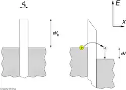 де перший член враховує вклад тунельного електрона, а другий - роботу поляризації. За визначенням, вільна енергія є різниця між повною енергією , яка зберігається приладом, та роботою, яку виконує зовнішнє джерело живлення: