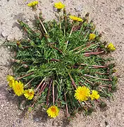 Листки (до 20 см завдовжки) у прикореневій розетці, численні, притиснуті до ґрунту або висхідні, зісподу опушені або голі, стругоподібні, перистолопатеві або перистороздільні з широкотрикутними вниз спрямованими частками, часто з рожевою середньою жилкою. Кошики великі (20-25 мм завдовжки, 7—10 мм заввишки) з дзвоникуватою багаторядною обгорткою, зовнішні листочки якої відігнуті донизу. Жолобки на листках збирають вологу і направляють її струмками до кореня[5].