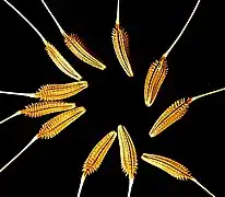 Плід — світла веретеноподібна циліндрична сім'янка (до 3 мм завдовжки), зверху гострозубчаста, з багаторядним білуватим чубком.