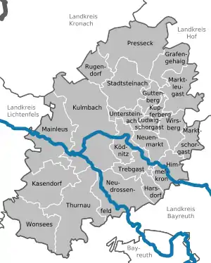 Район складається з 3 міст (нім. Städte), 10 торговельних громад (нім. Märkte) та 9 громад (нім. Gemeinden):