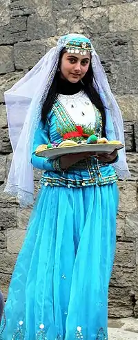 Азербайджанський жіночий одяг кінця XIX — початку XX ст. складалася з нижньої і верхньої сукні, а також покривала — чадри. Місцеві відмінності в одязі стосувалися окремих деталей, не змінюючи загального вигляду національного костюма. Спідня жіноча сукня включала тунікоподібну сорочку (кейнек), різного крою спідниці (шелте, джют-туман) і штани — вузькі (дарбалаг) і широкі (джютбалаг). Верхня сукня складалася з верхньої сорочки (вуст кейнек), короткого одягу — архалук, поширеного в основному в південно-західній зоні Азербайджану, в західних районах відомий як кюляджа, а на Апшероні — дон. У районах Гянджі і Шекі носили також одяг з рукавами і вирізками під пахвою — леббаде. Поверх архалуку носили шкіряний або оксамитовий пояс (кемер). Жінки із заможних родин носили золоті або срібні пояси. На ноги одягали яскраві різнокольорові шкарпетки (джораб), орнамент, візерунок яких схожий з місцевим килимовим орнаментом. При виході з будинку одягали поверх шкарпеток туфлі (башмаг) з гострими загнутими догори носками. На шиї багаті жінки носили намисто з довгастих намистин у формі ячменю — арпа. Заплітаючи волосся у коси, жінки ховали їх у парчевий вузький чохол — чутгу. Головний убір зазвичай складався з невисокої шапочки з круглим плоским денцем і прямим обідком. Поверх шапочки пов'язували невелику шовкову хустку кялагаї. Волосся, долоні, нігті фарбували хною. Традиційне мистецтво і символіка кялагаї, його виготовлення і носіння включені від Азербайджану в список нематеріальної культурної спадщини ЮНЕСКО[33].