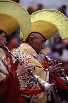 У релігійних ритуалах використовують такі музичні інструменти: ролмо (пласкі музичні тарілки), нга (підвішені барабани), дамару (ручні барабани), дрілбу (дзвіночки), дунгчен (довгі труби), ганлін (конічний гобой), дункар (раковина) та ін..
