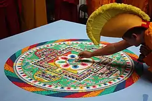 Окремо варто згадати мистецтво «пісочної мандали» — малюнок складної геометричної форми, викладений з різнокольорового піску. Буддійські ченці ретельно, протягом багатьох днів, створюють ці картини. Потім, в певний день, при великому скупченні народу, зображення руйнується, а пісок роздають віруючим[5].