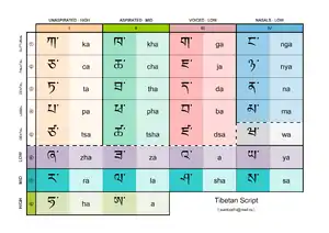 Для запису використовується тибетське письмо, яке, в свою чергу, походить від писемності брахмі (за деякими джерелами — гупта). Тибетський алфавіт був введений в першій половині VII століття за указом царя Сронцангамбо і розроблений Тхонмі Самбхота.