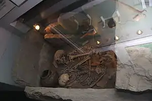 В кількох місцях досліджено по кілька кам'яних скринь, що, треба думати, свідчить про існування у цих племен могильників. У кам'яних скринях ховали як окремих людей, так і цілі групи. В тих рідких випадках, коли вдавалося встановити стать похованих, виявилося, що це були чоловіки, або чоловіки з жінками. Парні поховання наводять багатьох дослідників на думку, що жінок приносили в жертву і ховали разом з їх чоловіками. Такий звичай називається «саті» і в свій час він був поширений у багатьох індоєвропейських народів.