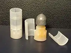 - Контейнер, що складається з двох половинок, вдягають на головну частину кулі і вводять в гільзу при спорядженні. Внутрішня поверхня контейнера виконана за формою головної частини кулі. Стовщена нижня частина спирається в ребра хвостовика. При покиданні ствола контейнер розділяється на дві половинки і відлітає від кулі[2][3].