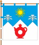 Квадратне полотнище поділене горизонтально на дві рівновеликі смуги у п'ять зламів, бічні нижчі від середнього. На білій смузі червоний куманець, на синій смузі жовте сонце без обличчя з шістнадцятьма променями, по сторонам від якого з бічних зламів б'ють білі фонтани.