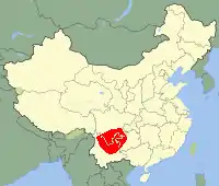 Мешкає у китайських провінціях Юньнань, Сичуань, Гуаньсі, Гуйчжоу, Хубей, інколи трапляється на півночі В'єтнаму.