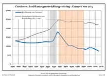 Динаміка населення з 1875 року в сучасних кордонах (Синя лінія: населення; Пунктир: відносна порівняльна динаміка населення землі Бранденбург; Сірий фон: період Третього рейху; Помаранчевий фон: період НДР)