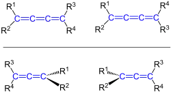 Ізомерія кумуленів: цис-транс-ізомери при непарному числі зв'язків (вгорі) і енантіомери при парному числі зв'язків (внизу). Система кумульованих зв'язків виділена синім.