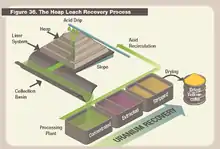 Процес застосовується з 1963 року у Франції, Іспанії, Мексиці. До кондиційних відносять руди, що містять > 0.02 % урану. До бідних відносять руди із вмістом урану від 0.02 до 0.01 %. Маса купи коливається від 1000 до 16000 т. Крупність матеріалу 0 — 120 (400) мм. Вилуговування проводять сірчаною кислотою при рН 1.6. Основа майданчика і резервуари виконані з полівінілу. Вилуговування триває 7 — 9 місяців. Витрата кислоти 10.5 — 12.5 кг/т і більше. Вилучення урану становить 68 — 80 %.