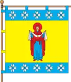 Квадратне полотнище поділене горизонтально на синю, жовту і синю смуги у співвідношенні 1:4:1. На верхній і нижній смугах по п'ять білих восьмипроменевих зірок в ряд, пробитих горизонтально, вертикально і по діагоналях. На центральній смузі Матір Божа в лазуровому вбранні і червоному плащі, яка тримає в руках білий Покров.