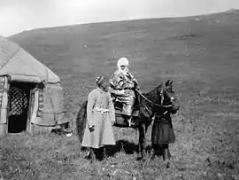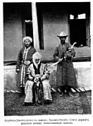 Курманджан-датка (в центрі) з сином Асанбеком (зліва) і слугою, що тримає родову шашку, подаровану кокандським ханом