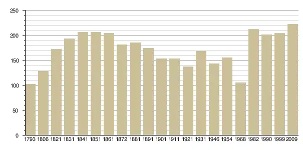 - Recensements par l’INSEE, наведено за французькою вікіпедією