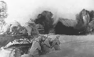 ![]() Радянський танковий десант за підтримки танка Т-34 атакує село, зайняте військами вермахту. Попереду видно розриви вогневого валу. Грудень 1941. Радянський танковий десант за підтримки танка Т-34 атакує село, зайняте військами вермахту. Попереду видно розриви вогневого валу. Грудень 1941. | |||||||