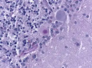 ![]() Мікропрепарат мозочку, отриманий при розтині головного мозку померлого. Пляма бузкового забарвлення в центрі мікропрепарату — це вогнище атрофії мозочку, як це відбувається при куру Мікропрепарат мозочку, отриманий при розтині головного мозку померлого. Пляма бузкового забарвлення в центрі мікропрепарату — це вогнище атрофії мозочку, як це відбувається при куру | |