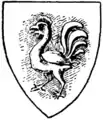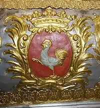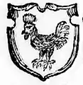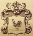 У червоному полі срібний півень в право із золотими зброєю, гребенем і підборіддям на зеленій траві[15]. Над шоломом геральдична корона, а над нею поміщений клейнод у вигляді півня з герба, але з розпростертими крилами[16].