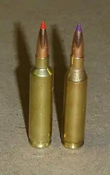 - 7 mm-08. Дульце гільзи .308 Winchester було зменшено до 7 мм (.284 калібр). Набій 7 мм-08 має плоскішу траєкторію з легшою, більш аеродинамічною кулею 7 мм.[14]