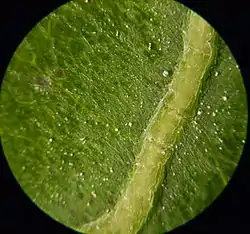 Поверхневий наліт воску, що формує верхній шар кутикули, на листку цвітної капусти (Brassica oleracea var. botrytis).