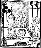 Персонал кухні знаті або королівського двору іноді налічує більше сотні осіб: хлібники, пекарі, вафельники, соусники, холодники, м'ясники, різники, пажі, доярки, дворецькі і незліченна кількість кухарчуків. Це в той час, коли середнє селянське господарство забезпечується дровами зібраними з довколишніх лісів, кухні мають бідне матеріально-технічне забезпечення і щодня готується вдвічі менше страв для декількох сотень людей. Поради про те, як підготуватися до дводенного бенкету, знайдено в кулінарній книзі Du fait de cuisin („На кухні“), що написана у 1420 році біля бургундійського герцогтства[40] від Майстра Шика, шеф-кухаря Амадея VIII, савойського герцога.[41] Шика рекомендує, що шеф-кухар повинен мати під рукою щонайменше 1000 возів „добрих, сухих дрів“ і повну комору вугілля.[42]