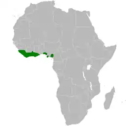 Вид поширений в Західній Африці. Трапляється від Сьєрра-Леоне до Камеруну. Живе у тропічних та субтропічних вологих низовинних лісах.