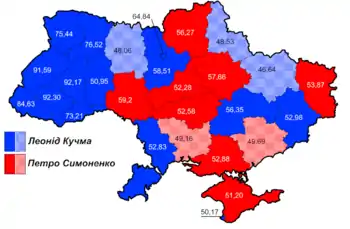 У 2-му турі: 52,15 %, найбільше в Криму і Севастополі — 89,7 та 91,5 %, найменше в Тернопільській, Івано-Франківській та Львівській областях — 2,5-3,5 % голосів. З шести суперників головним конкурентом на виборах став на той час чинний президент — Леонід Кравчук, набрав у першому турі 37,92 %, а у другому — 45,1 % голосів.