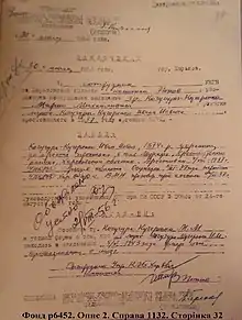 № 108сс від 24 серпня 1955 року пропоную повідомити гр. М. М. Кучугуру-Кучеренко в усній формі, про те, що її чоловік Кучугура-Кучеренко І. І., знаходячись в ув'язненні, 5 травня 1943 року помер від крововиливу в мозок».