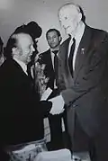 А. Кос-Анатольський вітає А. Кушніренка після концерту Буковинського ансамблю в Львівській філармонії (1977)
