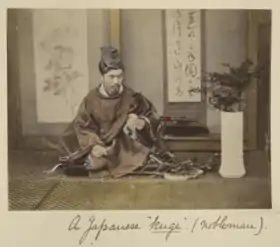 Японська аристократія походить від місцевої знаті стародавньої Японії, яка увійшла до політико-адміністративної системи японської держави Ямато впродовж 4—9 століть. Ця аристократія була згуртована довкола імператорського двору, який з 9 століття називався куґе, тобто «державним домом». У другій половині 9 століття терміном куґе почали позначати людей двору, як родовитих бюрократів так і простих чиновників столиці Кіото.