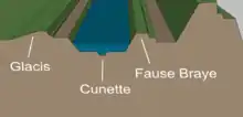 В епоху гладкоствольної артилерії являв собою рів 4—6 м завширшки і 1,8—2,4 м завглибшки, зазвичай наповнений водою, який слугував перешкодою для нападників при переході ними рову; з цією метою, для посилення перешкоди, іноді відлогості кюнету укріпляли мурованою кладкою.