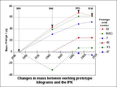 До 2018 року кілограм залишався єдиною одиницею SI, визначеною за допомогою артефакту. Раніше такою ж одиницею був метр, але потім він був перевизначений через інваріантну фізичну сталу (довжину хвилі світла, випроміненого криптоном), таким чином одиницю довжини стало можливим відтворити в різних лабораторіях світу, користуючись інструкціями. На 94 конференції Міжнародного комітету мір і ваг 2005 року[36] була прийнята рекомендація, що схожу процедуру потрібно провести з кілограмом.