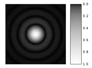 Зображення Ейрі кілець змодельоване на комп'ютері. Інтенсивності подані в градації сірого, щоб збільшити яскравість зовнішніх кілець.