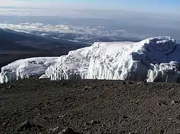 Льодова шапка Кіліманджаро обмежується вершиною Кібо. У 2003 році вона покривала територію загальною площею 2 км². Вона складається з льодовика Фюртванглера (англ. Furtwängler) у верхній частині, льодовиків Дрігальський (англ. Drygalski), Великий Пенк (англ. Great Penck), Малий Пенк (англ. Little Penck), Пенгальський (англ. Pengalski), Льортшер Нотч (англ. Lörtscher Notch) та Креднер (англ. Credner) на північному льодовому полі (англ. Northern Icefield), льодовиків Барранко (англ. Barranco)(або Малий та Великий Розломи (англ. Little Breach, Big Breach)), Стріла (англ. Arrow) та Уліг (англ. Uhlig) на заході, льодовиків Балетто (англ. Balletto), Діамант (англ. Diamond), Хайм (англ. Heim), Керстен (англ. Kersten), Декен (англ. Decken), Ребман (англ. Rebmann) і Ратцель (англ. Ratzel) на південному льодовому полі (англ. Southern Icefield) і, нарешті, східного льодового поля (англ. Eastern Icefield). Географічна мінливість опадів і сонячного світла пояснює різницю в розмірах між різними льодовими полями.