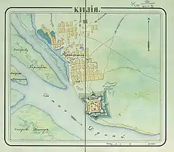 ![]() Історики припускають, що фортецю заклали в XI столітті візантійці і назвали Лікостом (Вовча паща). У XIV столітті Лікостом перебудували італійці (Генуя), які контролювали в той час чорноморські торговельні потоки. Достовірно відомо, що фортецю Кілії в XV столітті значно розширили і зміцнили молдовани (Молдовське князівство), у 1484 році захопили і перебудували турки-османи. У XVI-XVII століттях фортецю не раз захоплювали Запорізькі козаки, а в 1806-му Кілію взяли російські війська на чолі з Арманом де Рішельє. Фортечні стіни охоплювали весь сучасний центр міста і ділили середньовічну Кілію на три райони (двори) — зовнішній, внутрішній, і цитадель. Цитадель перебувала на березі Дунаю і являла собою чотирикутний замок з чотирма круглими вежами по кутах. У XIX-XX століттях фортеця була розібрана місцевими жителями, позаяк втратила своє значення і ускладнювала зростання міста. Від фортеці залишилися лише два ставки на місці захисного рову. Зараз на місці фортеці розкинувся міський парк. | ||||||||||||||