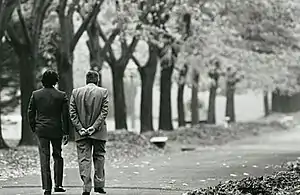 Президенти Рауль Альфонсин і Карлос Менем гуляють у парку резиденції Кінта-де-Олівос (1989)