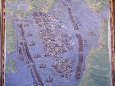 Обидві сторони готувались до вирішального бою, для якого вони, за деякими оцінками, зібрали від 70 до 90 відсотків усіх галер Середземного моря. Сили були приблизно однаковими: Османський флот був більшим, маючи 300 суден проти 200 суден Ліги, християнськи галери були міцнішими. І той, і інший флот ніс близько 30 000 солдатів: у християн було удвічі більше гармат, османи могли розраховувати на великий і вишколений загін стрільців. 7 жовтня два флоти зустрілись у битві біля Лепанто, в якому османський флот зазнав розгромної поразки, втративши близько 30 000 людей. Окрім цього, було звільнено близько 12 000 християнських рабів, що були гребцями на османських галерах.